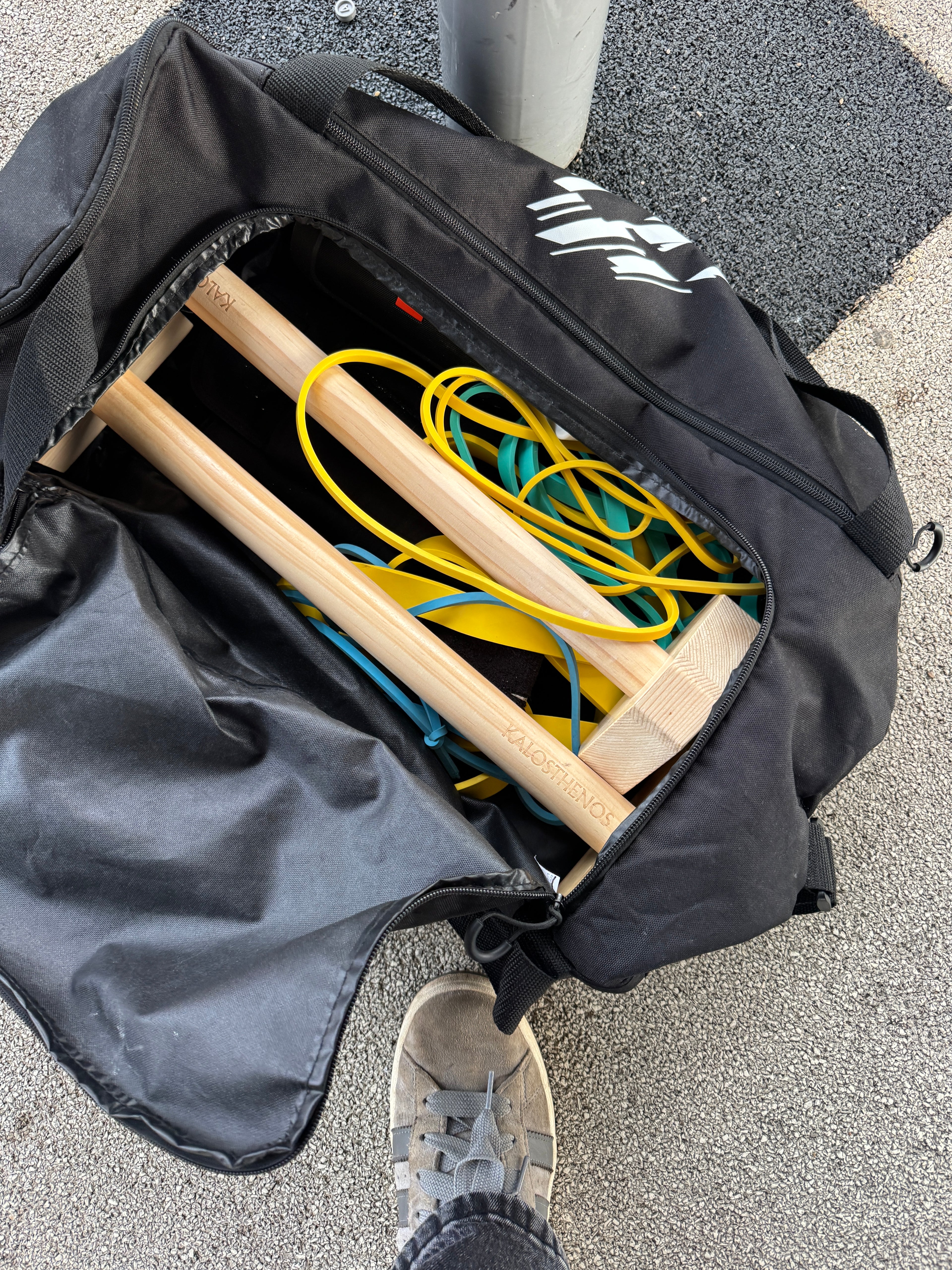 Nettoie les éléments en bois avec un chiffon sec ou légèrement humide et laisse-les sécher avant rangement. Les accessoires textiles et la bande de résistance doivent être aérés et séchés à l’air libre après utilisation. Range l’ensemble dans un endroit sec afin de préserver les matériaux et prolonger leur durée de vie.